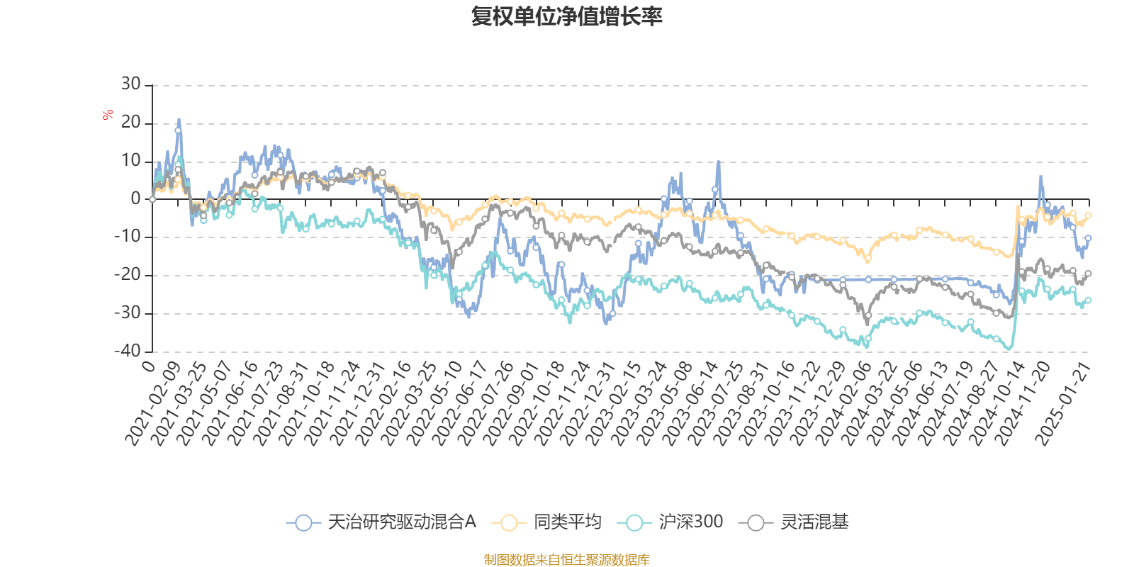 截至1月21日,天治研究驱动混合A近三个月复权单位净值增长率为-5.25%,位于同类可比基金105/113;近半年复权单位净值增长率为14.95%,位于同类可比基金14/113;近一年复权单位净值增长率为13.79%,位于同类可比基金28/113;近三年复权单位净值增长率为-5.76%,位于同类可比基金56/112。